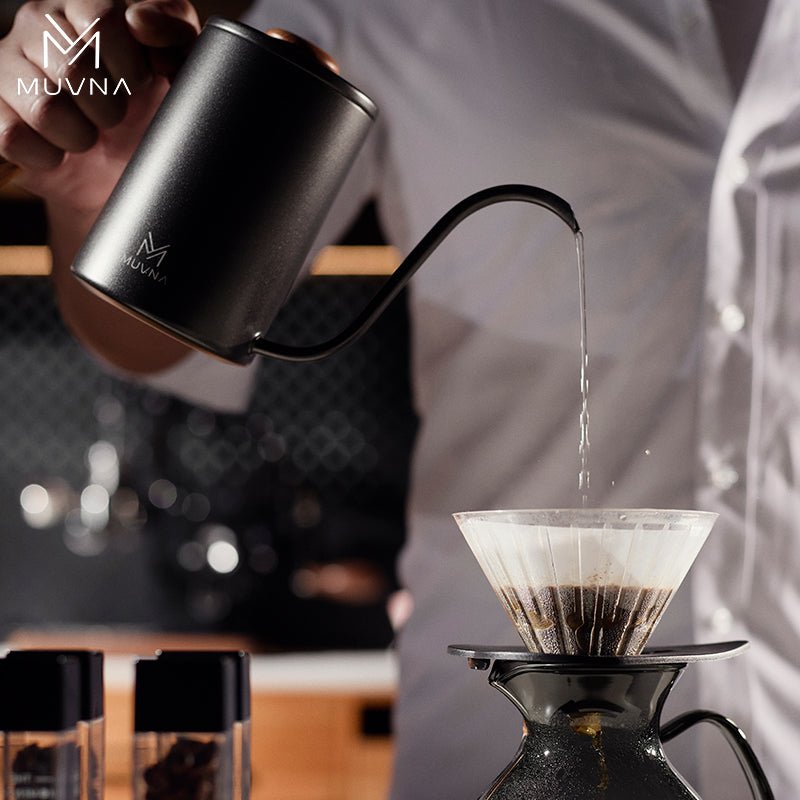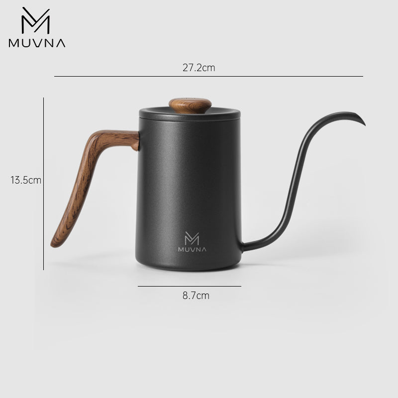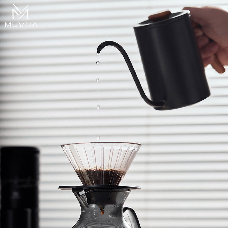 إبريق بور-أوفر أنيق للتحكم الدقيق في السكب. فوهة إوزّية طويلة تمنح تدفقًا ثابتًا قطرة-بقطرة، مع مقبض وخامة غطاء بتشطيب خشبي يسهّل الإمساك ويكمّل الطابع الفخم.