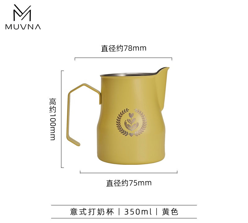 إبريق تبخير عالي الجودة من MUVNA، مصمم خصيصًا لعشّاق اللاتيه آرت ومحترفي الباريستا. يتميّز بتوازن مثالي بين التصميم العملي والمظهر الجمالي، مما يجعله خيارًا مثاليًا للاستخدام في المقاهي أو المنزل.