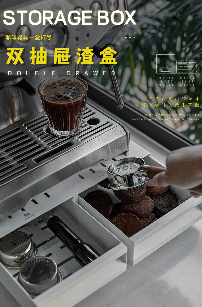 تساعدك على إبقاء أدوات القهوة مرتبة ونظيفة في مكان واحد، مع درجين منفصلين لتخزين البورتافلتر، الفلاتر، أو بقايا القهوة بعد الاستخلاص.